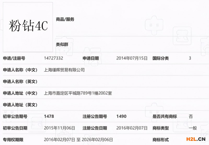 引證商標14727332的申請人為上海瑾暉貿(mào)易有限公司。申請日期為2014年7月15日。專用權(quán)期限至2026年2月6日。核定使用商品包括第3類、類似群0302;0304;0307;0309:清潔制劑; 研磨材料; 牙膏; 動物用化妝品。