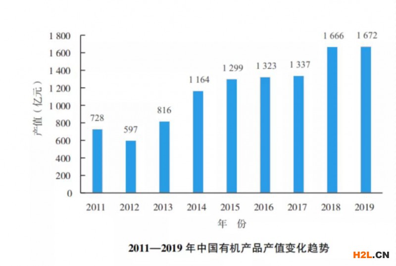 從2014年開始,我國有機(jī)產(chǎn)品產(chǎn)值一直在1000億元以上,與2018年相比,2019年我國有機(jī)產(chǎn)品產(chǎn)值增加了6億元, 同比增長0.36%。