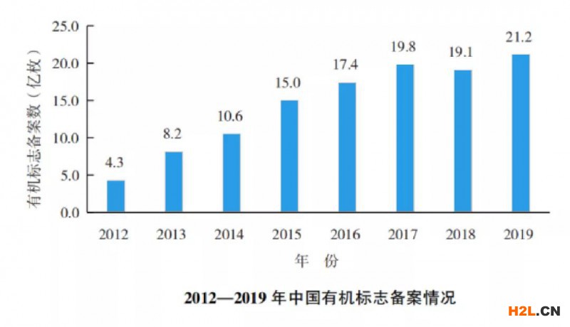 2012-2019年,我國有機(jī)產(chǎn)品標(biāo)志備案數(shù)量呈現(xiàn)增加的趨勢,2019年我國有機(jī)產(chǎn)品標(biāo)志備案數(shù)量為21億枚,相比2018年增加了2億枚。