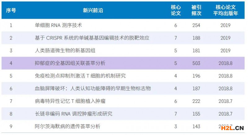 該領(lǐng)域中,共有9個新興前沿,主要研究主題包括神經(jīng)系統(tǒng)疾病、腫瘤相關(guān)基礎(chǔ)研究、腸道微生物、抑郁癥、基因編輯技術(shù)等相關(guān)研究。
