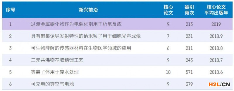 該領(lǐng)域中,共有6個新興前沿,主要涉及催化劑的制備和應(yīng)用、電池、納米生物材料、生物降解材料、化學(xué)工藝和廢水處理等領(lǐng)域。