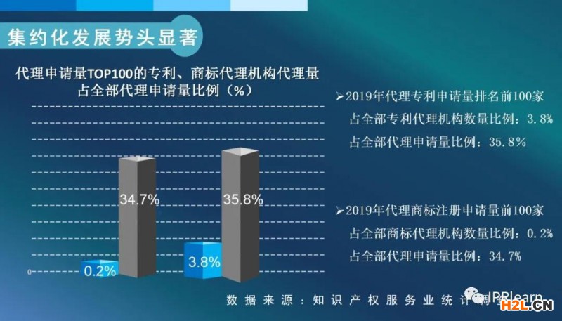 2019年代理專利申請量排名前100家的專利代理機(jī)構(gòu)(占全部專利代理機(jī)構(gòu)數(shù)量的3.8%),代理的專利申請量占2019年全部代理申請量的35.8%;2019年代理商標(biāo)注冊申請量前100家的商標(biāo)代理機(jī)構(gòu)(占全部備案商標(biāo)代理機(jī)構(gòu)數(shù)量比例不到0.22%),其代理商標(biāo)注冊申請量占2019年全部代理申請量的34.7%。超過一半的知識產(chǎn)權(quán)服務(wù)機(jī)構(gòu)集中在北京等5個省市。