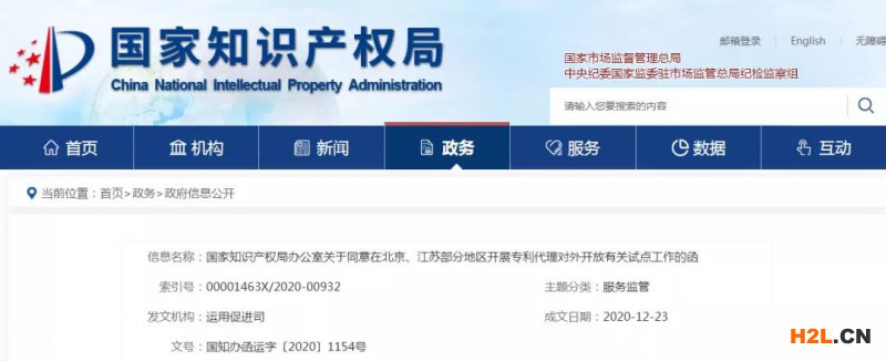 國家知識產(chǎn)權(quán)局辦公室關(guān)于同意在北京、江蘇部分地區(qū)開展專利代理對外開放有關(guān)試點(diǎn)工作的函