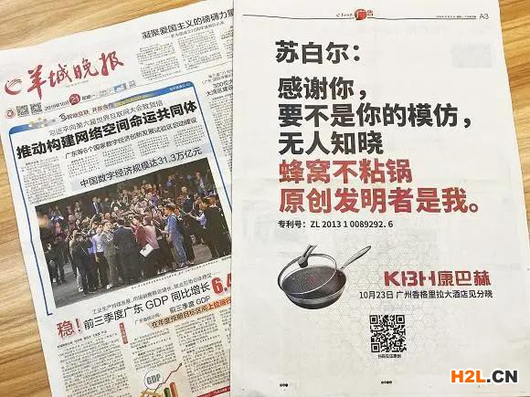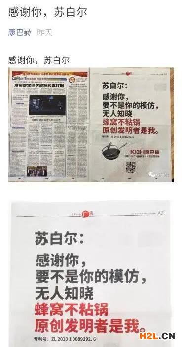 2019年10月22日,“康巴赫官方微博”所主持的“#感謝你蘇先生#”“#康巴赫的反擊#”微博話題持續(xù)發(fā)酵,多個(gè)大V轉(zhuǎn)發(fā)。其中主要的一條微博內(nèi)容為九宮格拼圖,包含8張海報(bào)和一張《羊城晚報(bào)》及其A3版面的照片,8張海報(bào)中大字體載明“李逵專利 李鬼模仿?真假難辨?咱們用產(chǎn)品品質(zhì)說(shuō)話”等言語(yǔ),直指蘇泊爾侵權(quán)。