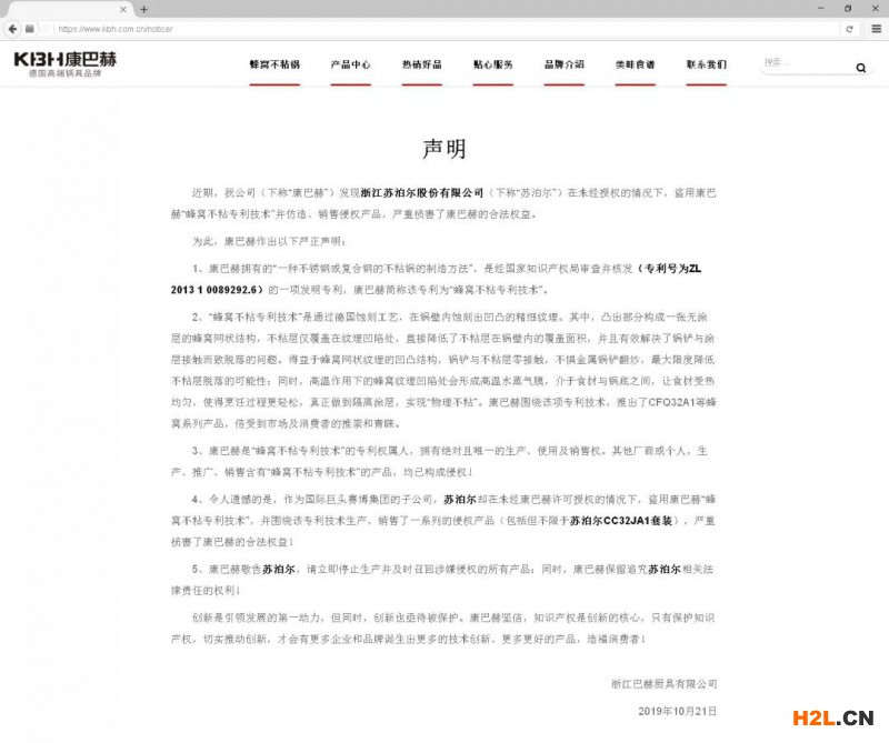 掃描這個(gè)二維碼,跳轉(zhuǎn)至浙江巴赫廚具有限公司(以下簡(jiǎn)稱巴赫公司)官網(wǎng)上刊登的一份《聲明》,內(nèi)容包括“我公司發(fā)現(xiàn)浙江蘇泊爾股份有限公司在未經(jīng)授權(quán)的情況下,盜用康巴赫‘蜂窩不沾專利技術(shù)’并仿造、銷售侵權(quán)產(chǎn)品,嚴(yán)重?fù)p害了康巴赫的合法權(quán)益……”