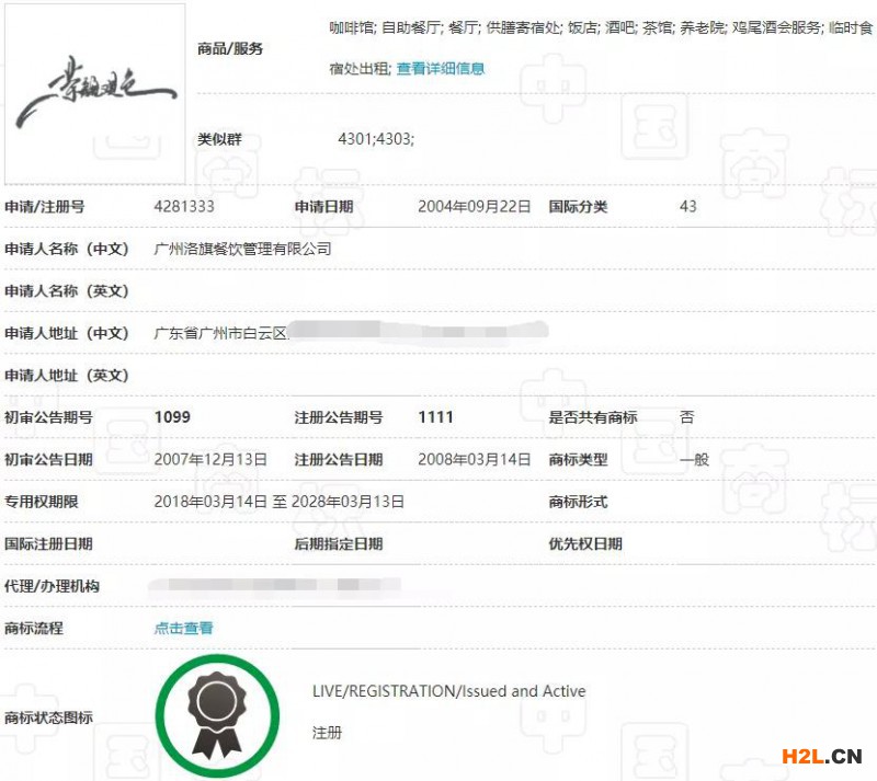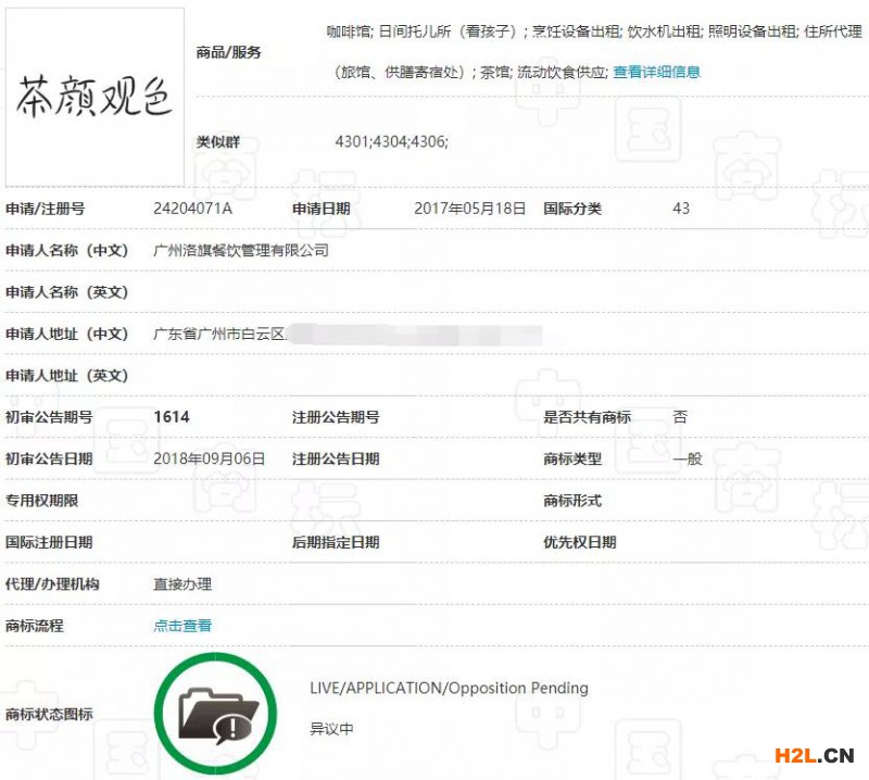 而最早的“茶顏觀(guān)色”商標(biāo)則是廣州洛旗餐飲管理有限公司(下稱(chēng)廣州洛旗餐飲)在2004年9月22日申請(qǐng)注冊(cè),起初圖標(biāo)為毛筆字體的茶顏觀(guān)色四個(gè)字,和現(xiàn)在使用的字體以及茶顏悅色的字體差別很大,上面沒(méi)有女子圖案,商標(biāo)狀態(tài)圖標(biāo)同樣顯示為“注冊(cè)”。