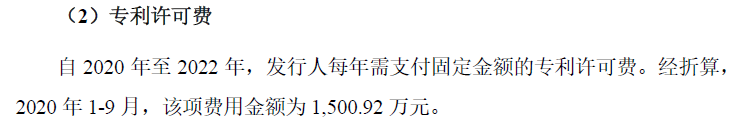 從招股書中披露的金額看,一次性和解費(fèi)是1.6億元人民幣,專利許可費(fèi)在2020年1-9月繳納了1500萬元,全年應(yīng)該在2000萬元。而且2020-2022年三年都需要繳納固定的專利許可費(fèi),三年大概6000萬元。