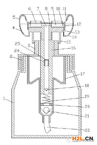 該專利產(chǎn)品在使用時,將洗手液盛放于盒體1內(nèi),需要洗手液時,單手手掌對按壓環(huán)5進行按壓,出液管16帶動單向閥I18向下移動,彈簧19被壓縮,兩單向閥之間的空間變小,壓力增大,使單向閥I18被打開,允許洗手液通過,洗手液經(jīng)過發(fā)泡網(wǎng)25后形成泡沫狀,泡沫向上移動并經(jīng)分液孔6噴至手掌上,手掌離開按壓環(huán)5時,在彈簧19的作用下,出液管16上移,兩單向閥之間的空間變大,單向閥II21被打開,盒體1內(nèi)的洗手液被吸入至兩單向閥之間,完成洗手液吸入。在第一次使用時,可先進行多次按壓,使洗手液和泡沫充滿于出液管16內(nèi)。該洗手液存放裝置打破了傳統(tǒng)的洗手液從側(cè)方噴出的結(jié)構(gòu)形式,使洗手液從上方噴出至手掌,單手即可穩(wěn)定完成洗手液的按壓出,操作更加方便。