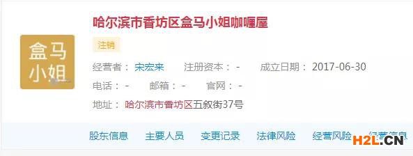 而與“盒馬小姐”關(guān)聯(lián)的公司則是哈爾濱市香坊區(qū)盒馬小姐咖喱屋,但該公司已處于注銷狀態(tài)。