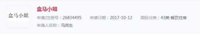 早在2017年10月12日自然人馮某就已經(jīng)申請了“盒馬小姐”商標(biāo)。