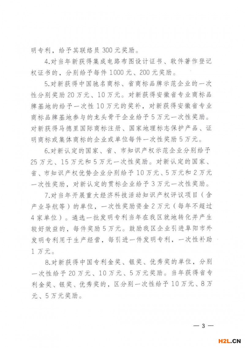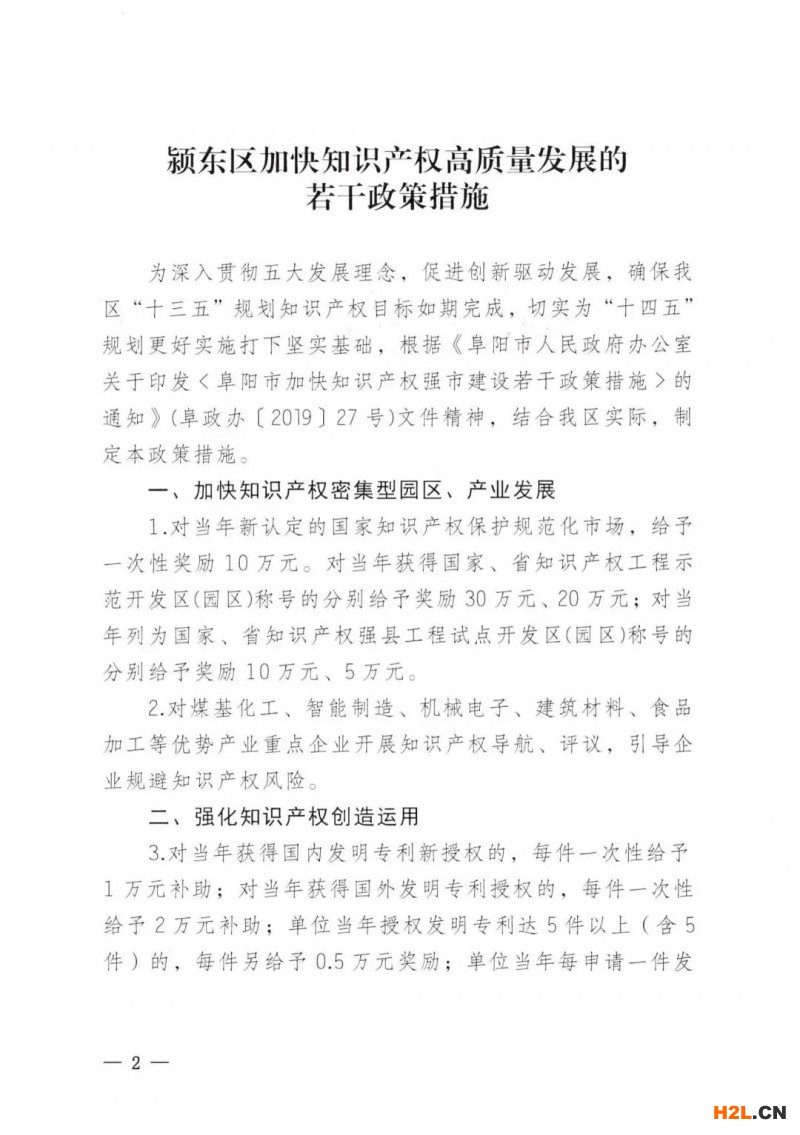 3.《潁東區(qū)人民政府辦公室關(guān)于印發(fā)〈潁東區(qū)加快知識(shí)產(chǎn)權(quán)高質(zhì)量發(fā)展的若干政策措施〉的通知》(潁東政辦〔2020〕5號(hào))