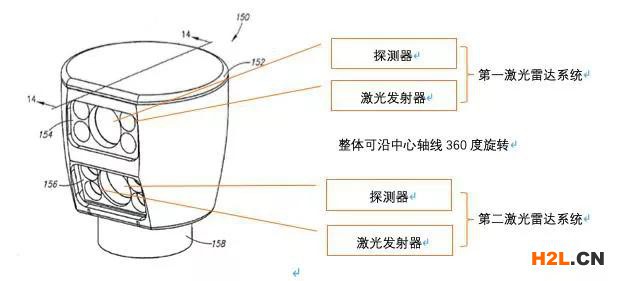 涉案專利US7969558B2名為“High Defintion lidar system”,這件專利于2007年7月13日提出,申請(qǐng)人為“Velodyne Acoustics Inc.”(威力登聲學(xué)),涉案專利主要涉及3D激光激光雷達(dá)系統(tǒng),其技術(shù)方案由位于同一旋轉(zhuǎn)軸上的兩套激光雷達(dá)系統(tǒng)構(gòu)成,第一和第二激光雷達(dá)系統(tǒng)具有一定的夾角,從而形成3D傳感信息,如下圖所示。