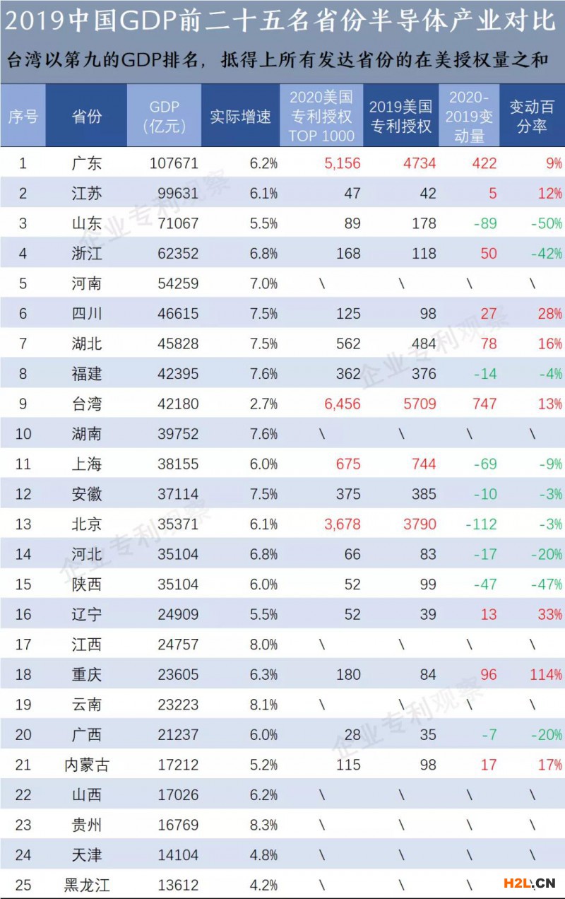 恰恰相反,臺(tái)灣以全國(guó)第九的GDP排名(2019年數(shù)據(jù)),在半導(dǎo)體行業(yè)的美國(guó)專利授權(quán)量卻遠(yuǎn)遠(yuǎn)超過(guò)國(guó)內(nèi)其他省份。甚至2019-2020年一年的新增授權(quán)量,臺(tái)灣?。?47項(xiàng))就要比所有大陸省份加起來(lái)都要多,這還是在臺(tái)灣幾乎全部都是半導(dǎo)體相關(guān)專利,而大陸真正是半導(dǎo)體專利連一半都不到的情況下,統(tǒng)計(jì)得出的數(shù)值。