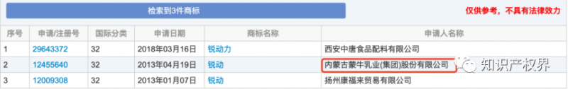 電視劇中“銳動(dòng)功能飲料”商標(biāo)所屬32類(lèi),在現(xiàn)實(shí)生活中,并未查詢(xún)到該商標(biāo)的申請(qǐng)、注冊(cè)信息,不過(guò)筆者查詢(xún)到共有3件32類(lèi)的“銳動(dòng)”相關(guān)商標(biāo)的申請(qǐng)信息,其中有一個(gè)申請(qǐng)人是蒙牛集團(tuán)。