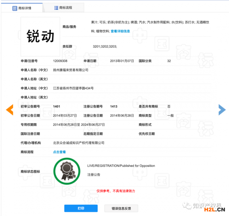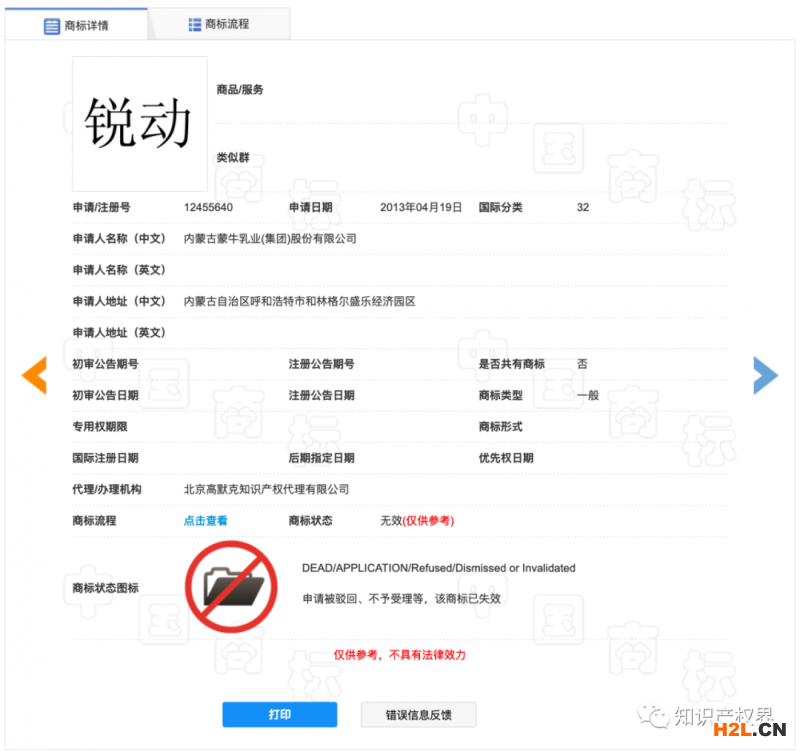 不過(guò)蒙牛集團(tuán)于2013年4月19日申請(qǐng)的這件類(lèi)別為32類(lèi)的第12455640號(hào)“銳動(dòng)“商標(biāo)目前是無(wú)效狀態(tài),成功注冊(cè)商標(biāo)的是揚(yáng)州康福來(lái)貿(mào)易有限公司于2013年7月1日申請(qǐng),2014年6月28日注冊(cè)的類(lèi)別為32類(lèi)的第12009308號(hào)“銳動(dòng)”商標(biāo)。