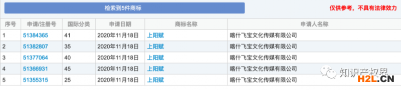 據(jù)查詢(xún),電視劇《上陽(yáng)賦》的出品公司之一喀什飛寶文化傳媒有限公司申請(qǐng)了5件“上陽(yáng)賦”商標(biāo),電視劇《有翡》出品公司之一上海好故事影視有限公司申請(qǐng)了17件“有翡”商標(biāo),電視劇《長(zhǎng)歌行》的出品公司之一浙江華策影視股份有限公司申請(qǐng)了1件“長(zhǎng)歌行”商標(biāo)。