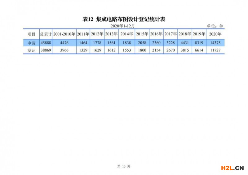 2020年,我國集成電路布圖設(shè)計登記申請14375件,發(fā)證11727件。