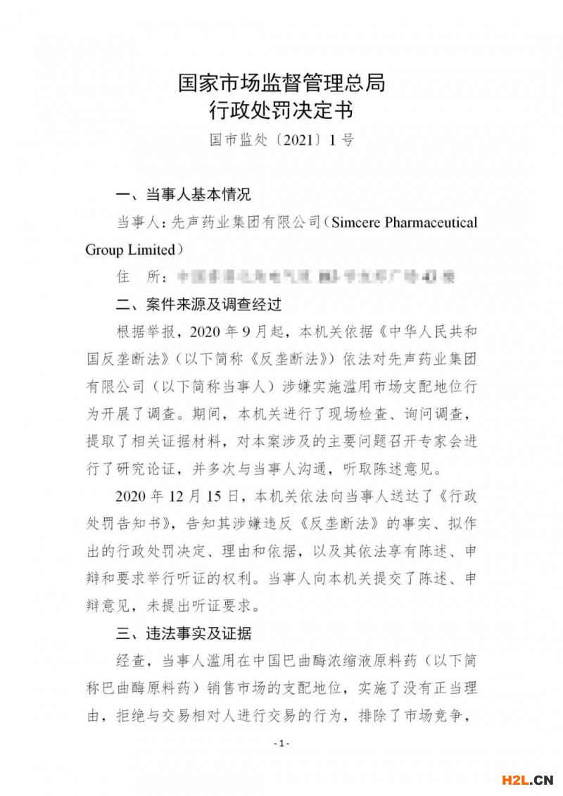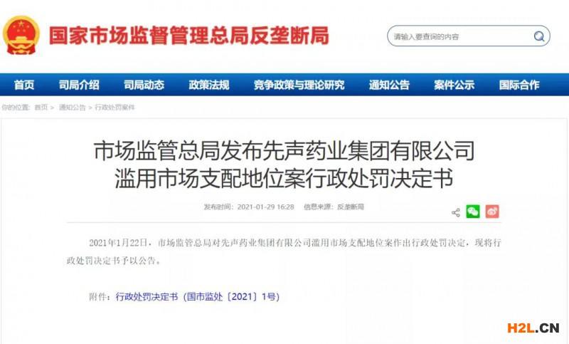 2021年1月22日,市場監(jiān)管總局對先聲藥業(yè)集團(tuán)有限公司濫用市場支配地位案作出行政處罰決定,責(zé)令當(dāng)事人停止違法行為;對當(dāng)事人處2019年度銷售額50.367億元人民幣2%的罰款,共計(jì)1.007億元人民幣。1月29日,總局官網(wǎng)將行政處罰決定書予以公告。
