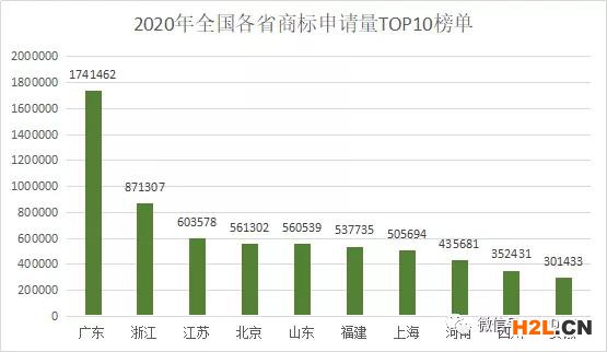 初步統(tǒng)計(jì),2020年,商標(biāo)申請(qǐng)量排名全國(guó)前3的省份/直轄市依次為:廣東?。?741462件)、浙江省(871307件)、江蘇省(603578件)。前10排名中,變化較大的有安徽省,排名上升1位,進(jìn)入TOP10榜單,北京市、上海市排名均下降1位,總體變化不大,商標(biāo)申請(qǐng)大省依然以廣東省為主。排名前10的省份/直轄市申請(qǐng)量合計(jì)6471162件,占全國(guó)總申請(qǐng)量的68.46%,同比下降0.64%。