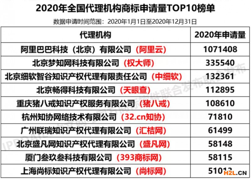 2020年度全國(guó)商標(biāo)代理機(jī)構(gòu)申請(qǐng)量排行榜(TOP100)
