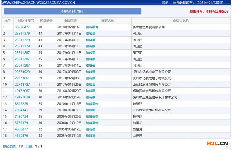 據(jù)商標(biāo)網(wǎng)查詢可知,截止2021年1月30日,共有18件“和諧福”相關(guān)商標(biāo)申請(qǐng),申請(qǐng)類別為第10、43、35等,最早申請(qǐng)時(shí)間為2005年5月12日。申請(qǐng)人中并沒有支付寶或者阿里巴巴等公司。