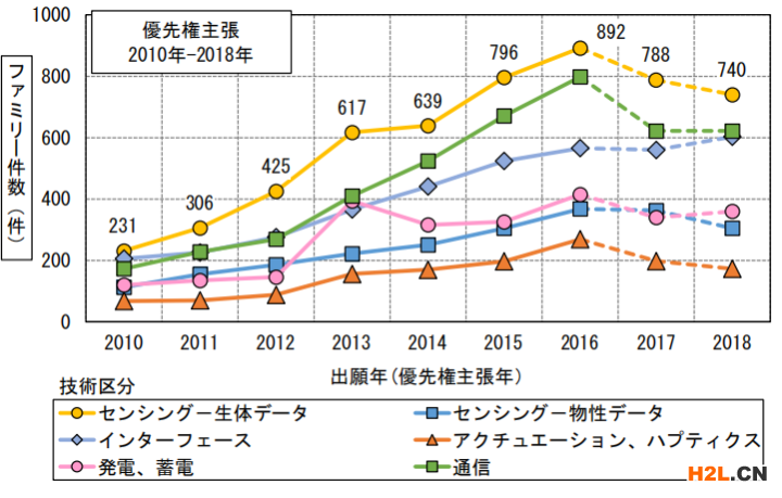 從技術(shù)類別來(lái)看,傳感(生物信息)最多,其次是通信和接口。其中傳感(生物信息)領(lǐng)域,中國(guó)申請(qǐng)人數(shù)量增長(zhǎng)較多,日本申請(qǐng)人數(shù)量較少,但在穩(wěn)步增加。
