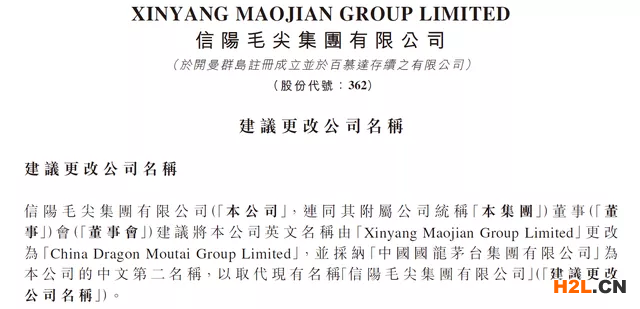 究其原因是,2月16日當天,港股上市公司信陽毛尖(HK.00362)發(fā)布公告,公司董事會建議將公司英文名稱由“Xinyang Maojian Group Limited”更改為“China Dragon Moutai Group Limited”,并采納“中國國龍茅臺集團有限公司”為公司的中文第二名稱,以取代現(xiàn)有名稱“信陽毛尖集團有限公司”。