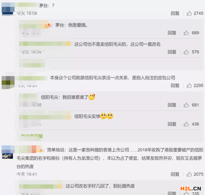 信陽毛尖擬更名“中國國龍茅臺集團有限公司”的消息一經(jīng)發(fā)布,就引來網(wǎng)友議論紛紛。有網(wǎng)友表示,“這公司改名字好幾回了,到處蹭熱度”;還有網(wǎng)友稱,“信陽毛尖實慘”“茅臺:倒是愛蹭”。