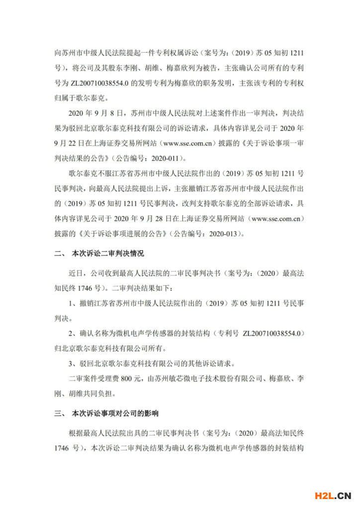 2月18日,科創(chuàng)板公司敏芯股份發(fā)布關(guān)于訴訟事項(xiàng)二審終審判決結(jié)果的公告,最高人民法院判決“微機(jī)電聲學(xué)傳感器的封裝結(jié)構(gòu)”專利(專利號(hào)ZL200710038554.0)歸歌爾泰克所有。