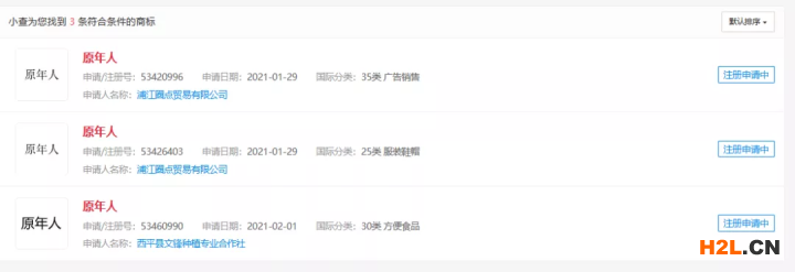 據(jù)企查查顯示,近日,兩家公司申請(qǐng)注冊(cè)“原年人”商標(biāo),國(guó)際分類涉及廣告銷售、服裝鞋帽、方便食品,商標(biāo)狀態(tài)均為“商標(biāo)申請(qǐng)中”。