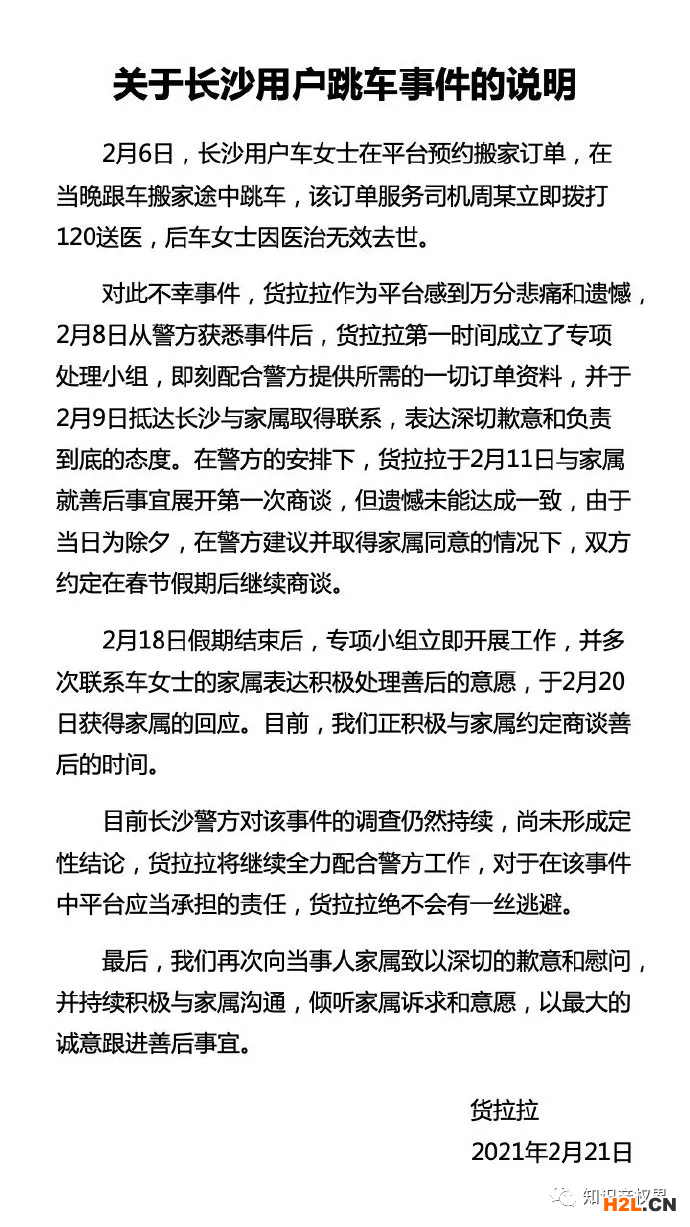 2月24日上午9點(diǎn),貨拉拉官方微博@貨拉拉App 發(fā)布“關(guān)于用戶跳車事件的致歉和處理公告”,向死者家屬道歉,稱“對事件的發(fā)生,平臺負(fù)有不可推卸的責(zé)任”。貨拉拉承認(rèn)平臺在三個(gè)層面存在明顯問題,包括安全預(yù)警缺失、產(chǎn)品安全功能不完善、善后跟進(jìn)速度慢等。
