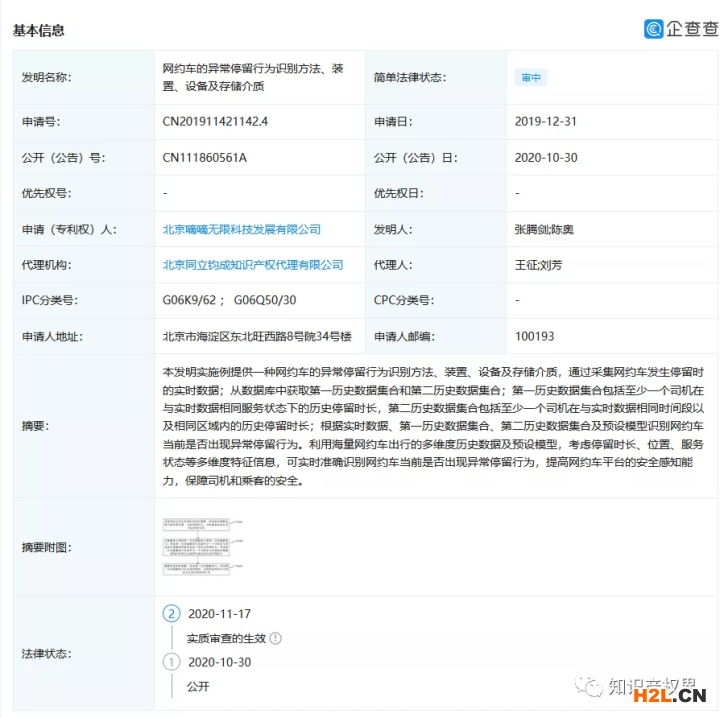 該專利于2019年12月31日申請,申請?zhí)枮镃N201911421142.4.利用海量網(wǎng)約車出行的多維度歷史數(shù)據(jù)及預(yù)設(shè)模型,考慮停留時(shí)長、位置、服務(wù)狀態(tài)等多維度特征信息,可實(shí)時(shí)準(zhǔn)確識別網(wǎng)約車當(dāng)前是否出現(xiàn)異常停留行為,提高網(wǎng)約車平臺的安全感知能力,保障司機(jī)和乘客的安全。