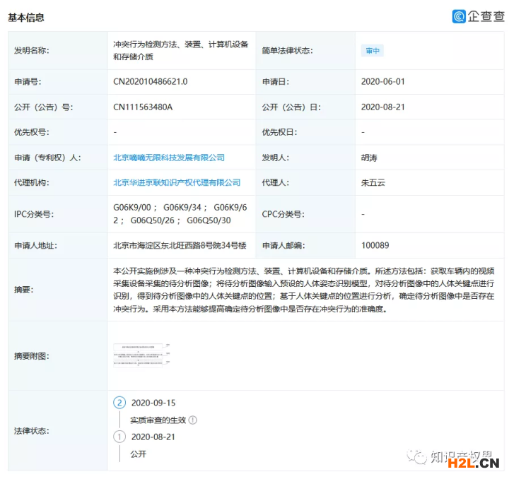 該專利于2020年5月21日申請,申請?zhí)枮镃N202010437410.8.該專利的申請背景為:由于車輛空間狹小并且封閉,為了確保司機(jī)以及乘客的安全,可以部署圖像采集設(shè)備來采集車內(nèi)圖像。進(jìn)一步,可以基于圖像分析技術(shù)來確定車內(nèi)人物是否出現(xiàn)肢體沖突。