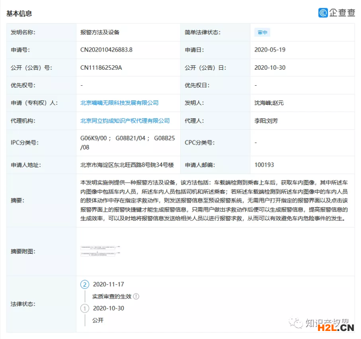 該專利于2020年5月19日申請,申請?zhí)枮镃N202010426883.8.該專利只需用戶做出求救動作后便可以生成報(bào)警信息,提高報(bào)警信息的生成效率,可以及時(shí)地將報(bào)警信息發(fā)送給相關(guān)人員以進(jìn)行報(bào)警求救,從而可以有效避免車內(nèi)危險(xiǎn)事件的發(fā)生。