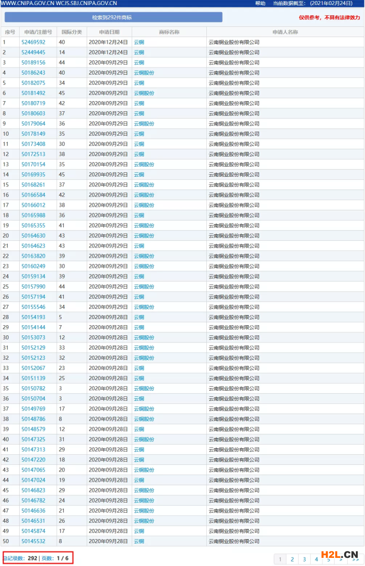 據(jù)中國商標網(wǎng)查詢可知,在云南銅業(yè)申請了“云銅”商標之后,云瑞之祥對剩余的全類別商標進行了注冊申請。截止2021年2月24日,“云銅”相關商標的申請注冊共有292個。