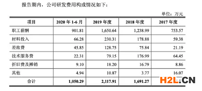 除此之外,藍(lán)科環(huán)保在研發(fā)費(fèi)用規(guī)模方面也十分有限。2017年-2020年上半年,公司的研發(fā)費(fèi)用分別為923.51萬元、1691.27萬元、2117.91萬元和1050.29萬元。就研發(fā)費(fèi)用構(gòu)成來看,職工薪酬與差旅費(fèi)占比較高,而材料投入占比則較小。