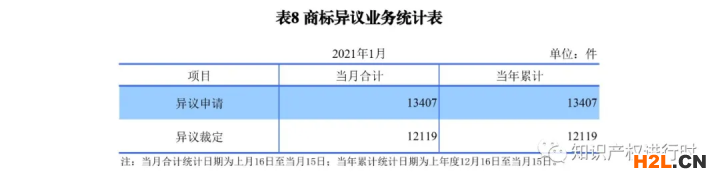 2021年1月,商標(biāo)異議申請1.3407萬件,完成異議案件審查1.2119萬件。
