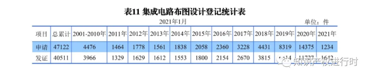 2021年1月,集成電路布圖設(shè)計(jì)登記申請1234件, 發(fā)證1642件。