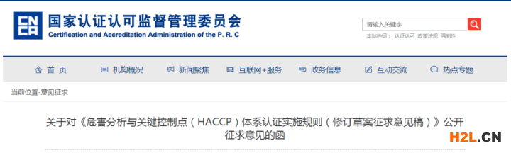 據(jù)認(rèn)監(jiān)委官網(wǎng)消息,為進(jìn)一步規(guī)范我國(guó)危害分析與關(guān)鍵控制點(diǎn)(HACCP)體系認(rèn)證活動(dòng),市場(chǎng)監(jiān)管總局認(rèn)證監(jiān)管司啟動(dòng)了HACCP認(rèn)證實(shí)施規(guī)則的修訂工作。認(rèn)監(jiān)委將修訂后的《危害分析與關(guān)鍵控制點(diǎn)(HACCP)體系認(rèn)證實(shí)施規(guī)則(征求意見(jiàn)稿)》公開(kāi)征求意見(jiàn)。征求意見(jiàn)的截止日期為2021年3月31日。