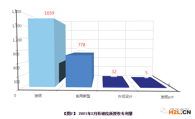 2021年2月科研院所授權(quán)專(zhuān)利2474件,如【圖2】所示,其中發(fā)明1659件、實(shí)用新型 778件、外觀設(shè)計(jì) 32件,PCT專(zhuān)利 5 件,發(fā)明專(zhuān)利占比67.06% 。