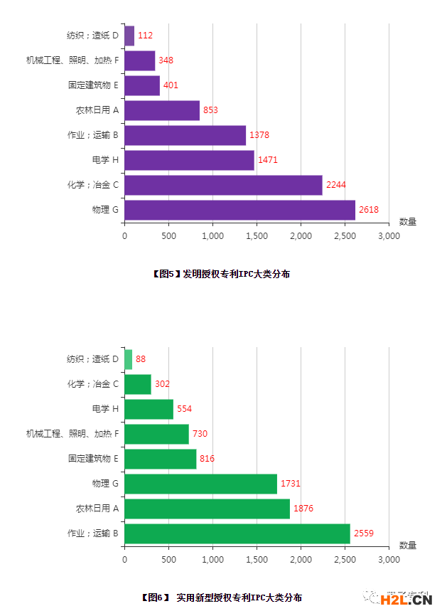 2021年2月高校發(fā)明授權(quán)專(zhuān)利IPC大類(lèi)分布如【圖5】所示,主要集中在G(物理)、C(化學(xué);冶金)、H(電學(xué))、B(作業(yè);運(yùn)輸),實(shí)用新型授權(quán)專(zhuān)利IPC大類(lèi)分布如【圖6】所示,主要集中在B(作業(yè);運(yùn)輸)、A(農(nóng)林日用)、G(物理);發(fā)明、實(shí)用新型授權(quán)專(zhuān)利IPC小類(lèi)如表【表3】、【表4】所示。