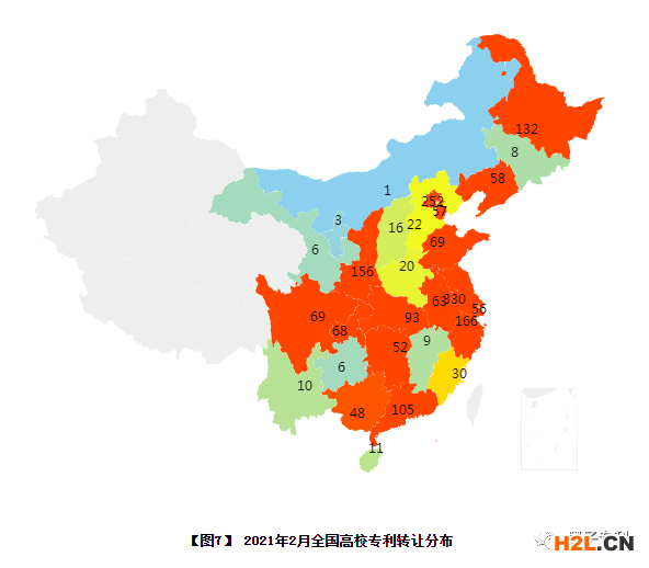 2021年2月全國(guó)高校專(zhuān)利轉(zhuǎn)讓分布如【圖7】,江蘇省以 330件專(zhuān)利發(fā)生轉(zhuǎn)讓位居第一、北京市 252 件、浙江省 166 件;轉(zhuǎn)讓專(zhuān)利TOP10的高校如【圖8】,其中哈爾濱工業(yè)大學(xué)轉(zhuǎn)讓120 件專(zhuān)利位居第一、北京航空航天大學(xué)轉(zhuǎn)讓90件專(zhuān)利位居第二,其次是江蘇大學(xué)轉(zhuǎn)讓 84件專(zhuān)利;科研院所專(zhuān)利轉(zhuǎn)讓TOP10如【圖9】,其中, 中國(guó)科學(xué)院上海硅酸鹽研究所,中國(guó)電子科技集團(tuán)公司第四十八研究所 30 件和21件,分別排名第一、第二。