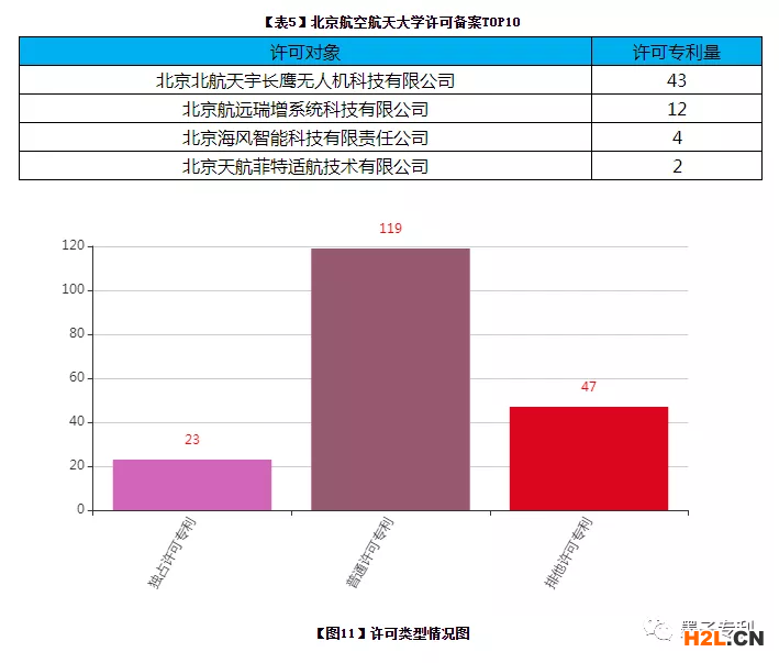 2021年2月全國(guó)高校與科研院所共 189件專(zhuān)利發(fā)生了 189次許可備案,其中 23件專(zhuān)利發(fā)生 23次獨(dú)占許可備案,119件專(zhuān)利發(fā)生了 119 次普通許可備案,47 件專(zhuān)利發(fā)生了47 次排他許可備案,如【圖11】所示;許可人情況如【圖12】,北京航空航天大學(xué)61 件專(zhuān)利發(fā)生許可備案。許可量第一的北京航空航天大學(xué)的專(zhuān)利許可備案情況如【表5】所示: