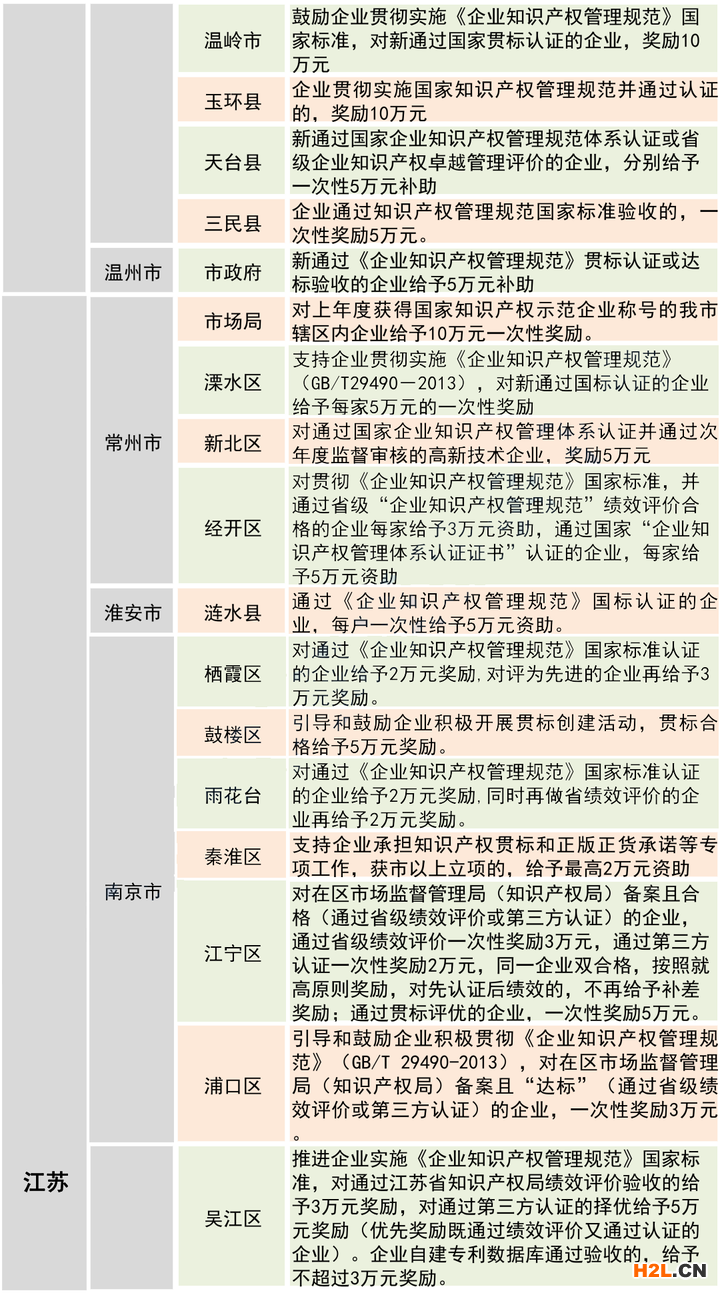 隨著市場經(jīng)濟全球化發(fā)展日益成熟,建立知識產(chǎn)權(quán)管理體系對企業(yè)作用越來越明顯。“貫標”對于企業(yè)來說,就是貫徹《企業(yè)知識產(chǎn)權(quán)管理規(guī)范》國家標準。企業(yè)知識產(chǎn)權(quán)管理規(guī)范的國家標準由國家知識產(chǎn)權(quán)局制訂,經(jīng)由國家質(zhì)量監(jiān)督檢驗檢疫總局、國家標準化管理委員會批準頒布,于2013年3月1日起實施。為建立企業(yè)知識產(chǎn)權(quán)工作的規(guī)范體系,認真貫徹落實《國家知識產(chǎn)權(quán)戰(zhàn)略綱要》,加強對企業(yè)知識產(chǎn)權(quán)工作的引導,指導和幫助企業(yè)進一步強化知識產(chǎn)權(quán)創(chuàng)造、運用、管理和保護,增強自主創(chuàng)新能力,實現(xiàn)對知識產(chǎn)權(quán)的科學管理和戰(zhàn)略運用,提高國際、國內(nèi)市場競爭能力,各地分別出臺了相應的獎補措施,現(xiàn)將各地2021年現(xiàn)行的知識產(chǎn)權(quán)管理體系認證獎勵補貼政策整理給各位,供參考。