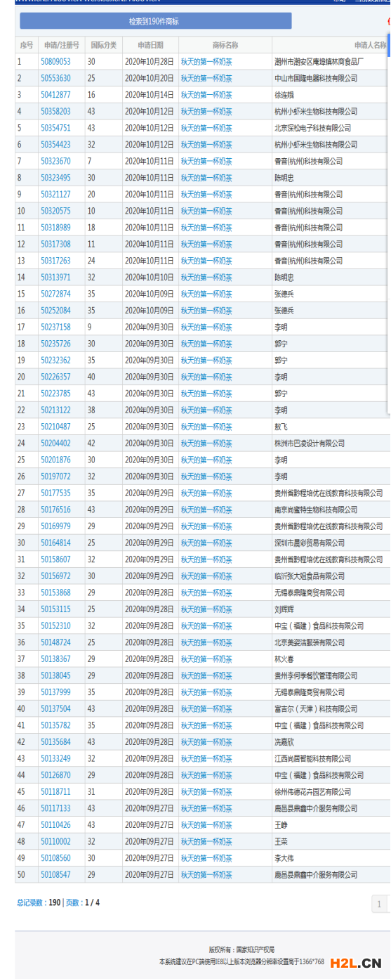 這樣一個高關(guān)注度的熱點,當(dāng)然也沒逃脫被注冊為商標的命運,爭搶第一枚“秋天的第一杯奶茶”商標的場景還歷歷在目。