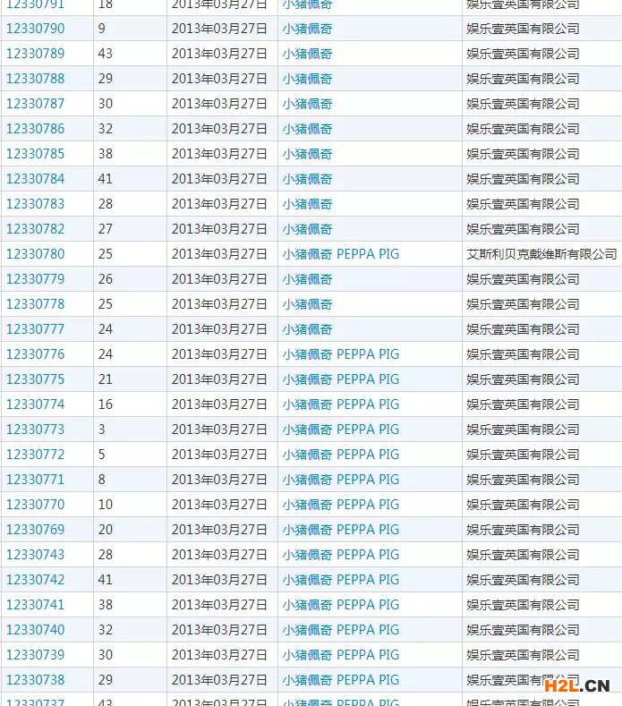 在商標(biāo)方面,2015年才進(jìn)入中國市場的小豬佩奇,實際上相關(guān)商標(biāo)早在2013年就已經(jīng)提交,并進(jìn)行了近乎全類別的注冊。從下圖所示,艾貝戴公司、娛樂壹公司對于“小豬佩奇”系列商標(biāo)的保護(hù)很是到位。