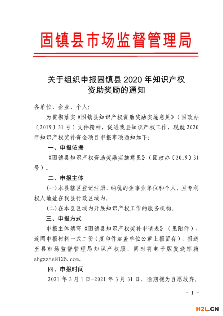 關(guān)于組織申報固鎮(zhèn)縣2020年知識產(chǎn)權(quán)資助獎勵的通知
