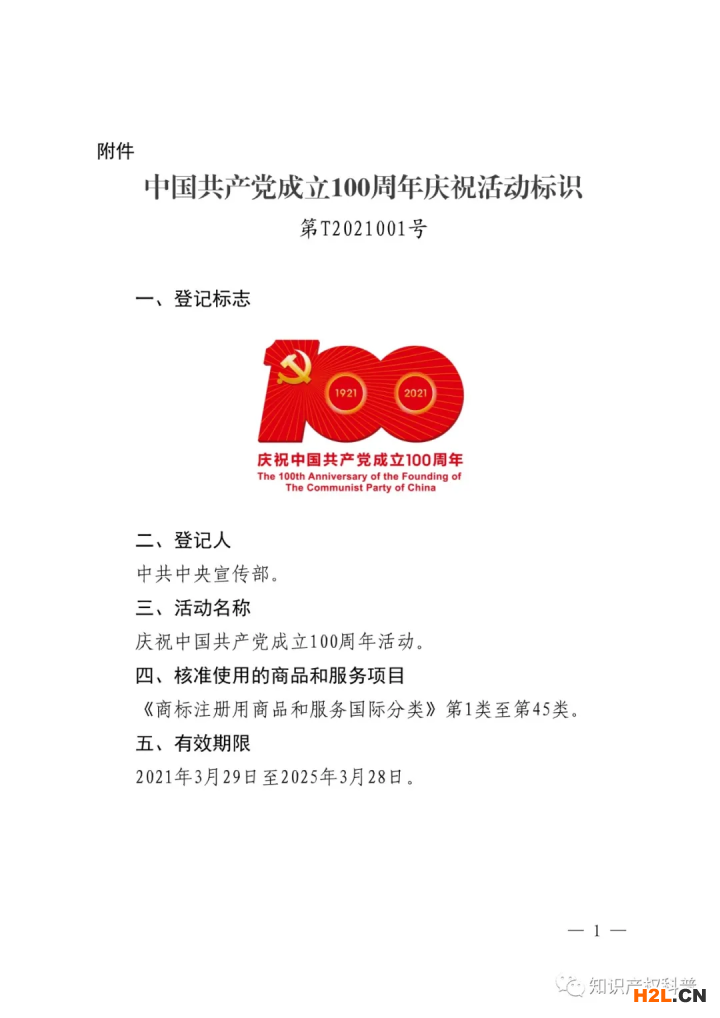 依據(jù)《特殊標志管理條例》,對中國共產(chǎn)黨成立100周年慶?;顒訕俗R特殊標志予以核準登記。