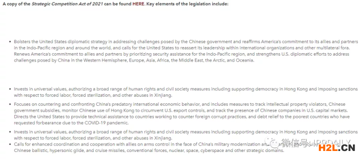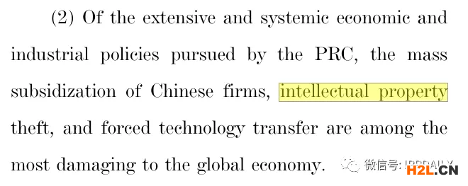 法案提到“對中國公司的大規(guī)模補貼,知識產權盜竊和強迫性技術轉讓對全球經濟的破壞最大”。