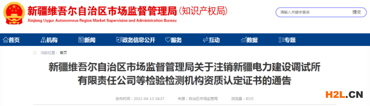 根據(jù)《中華人民共和國行政許可法》、《檢驗(yàn)檢測機(jī)構(gòu)資質(zhì)認(rèn)定管理辦法》(原國家質(zhì)量監(jiān)督檢驗(yàn)檢疫總局令163號),自治區(qū)市場監(jiān)督管理局決定注銷新疆電力建設(shè)調(diào)試所有限責(zé)任公司等9家檢驗(yàn)檢測機(jī)構(gòu)《檢驗(yàn)檢測機(jī)構(gòu)資質(zhì)認(rèn)定證書》,具體名單見附件。